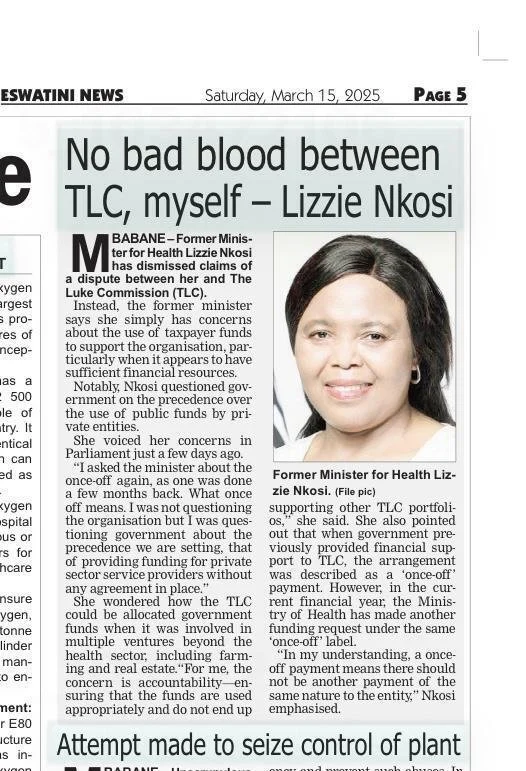 For the record, TLC has historically ignored the mutterings of Lizzie Nkosi out of deep respect for His Majesty and to maintain focus on the health and well-being of Emaswati. However, ongoing statements made by former Minister of Health and current Senator Lizzie Nkosi for the past several years regarding The Luke Commission (TLC) contain blatant falsehoods and misrepresentations, which leave us no choice but to address them. The claims are not only factually incorrect but also an insult to the integrity and sacrifice of TLC’s international donors, staff, VIP (Very Important Patients), and founders.